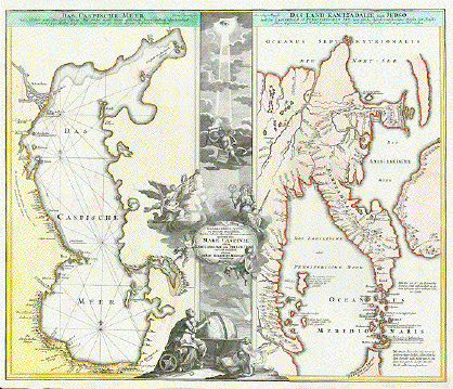 "Das Caspische Meer wie solches auf Ihre Gros-Czaar durch einen See-Capitain abgezeichnet ..." (Caspian Sea) "Das Land Kamtzadalie sonst Jedso..." (Kamchatka) Copper etching in original borderline hand coloring. Published by Johann Baptist Homann. Nuremberg, 1723 This two-tier map shows in great detail on the left the Caspian Sea and on the right Kamchatka peninsula with the kurile Islands. Map is divided by central part with the title cartouche allegories looked upon by the eye of God. Flawless. 48.5 x 57.5 cm (19 x 22.6") $ 600.00 Order Nr.CENTRALASIAMAP235371 |