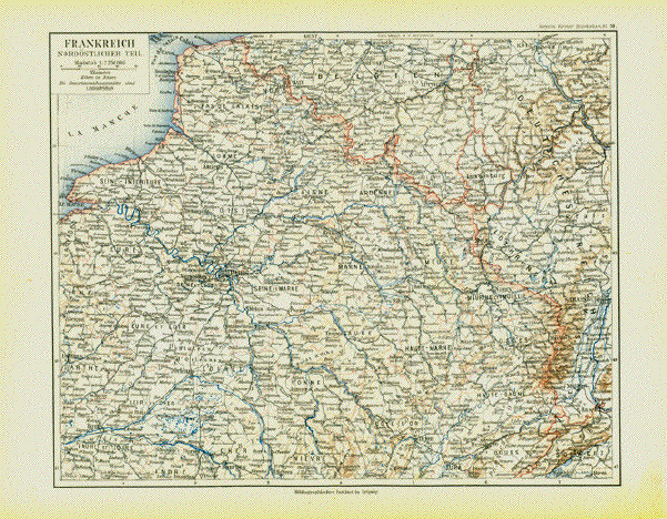"Frankreich Nordoestlicher Teil" This map featuretures the northeast part of France and Luxembourg. In the upper right is part of Germany and in the lower right is a bit of Switzerland. Published 1892. Light natural age toning. Vertical centerfold. Image: 21 x 26 cm ( 8.2 x 10.2") $ 25.00 minus 30% Discount = $ 17.50. Order Nr. FRANCEW257454 |