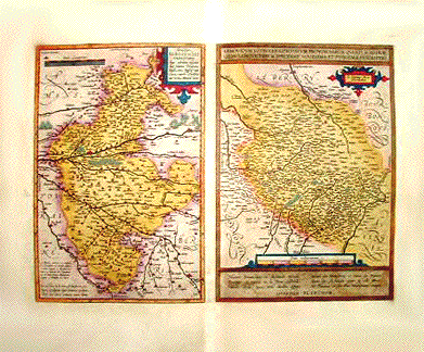 Left side: "Cenomanorum Galliae regionis, typus". Right side: "Britaniae et Normandiae Typus". Copper engraving by Matteo Ogerio for Abraham Ortelius. Dated 1594. Original hand coloring. These two maps are east-oriented (east is at the top) and "north" is on the left side. The backside of the left map has a text (in Latin) about the area shown. Almost in the center of the left map "Cenomanorum" is Le Mans. In the upper right of this map is part of the Loir River and its tributaries. At the bottom of the map, which borders on Brittany is the Comte de Domfront and the Comte de la Val. The right map clearly shows the coast of Brittany. At the top left of this map is Amiensl Notice the historical sailing vessel at the bottom and the decorative cartouche. Map has scattered spotting, especially in margins and especially on the lower edge of the bottom margin. Small repaired tear on lower margin edge.Overall age toning. Some light creasing along vertical centerfold. 37.2 x 50.5 cm ( 14.6 x 19.8 ") Order Nr. FRANCEMAP1209 SOLD |