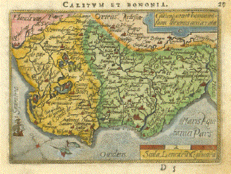 "Caletum et Bononia". Copper etching in modern coloring from the pocket atlas by A. Ortelius. Antwerp, ca 1580. This map is east oriented. (East is at the top, north on the left side.) In the upper left is a bit of Flanders. Near the decorative sailing vessel in the lower left is Calais. At the top of the map is La Vernol and Lobingen. On the backside is text in French about the region of Vermandois. Light spotting in margins. Upper marger is a bit narrow. Condition Better than Good. 7.7 x 10.5 cm ( 3 x 4.1 ") $90.00 Order Nr. FRANCE MAP 1174 |