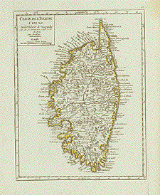 "Carte De L'Isle De Corse." Copper engraving by Robert de Vaugondy fils ca 1770. Original outline coloring. From the Italian edition of the atlas. Nice map of Corsica showing great detail along the coastline. A light brwn spot in upper right margin, otherwise fine. 21 x 16.3 cm ( 8.2 x 6.4 ") $ 170.00 Order nr. FRANCEMAP1230. |