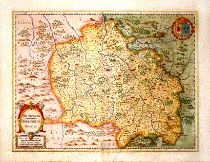 "Bourbonois Borbonium Ducatus. Copper etching. Recent hand coloring. Published by Jodocus junior and brother Heinrich Hondius. Amsterdam, 1632. Verso: Text in French. Right in the center of this attractive map is thr region in central France known as "Bourbonais". At the top centzer of the map is Nevers and on the right is Marsigny. The map extends as far south as Brulles and Rendan. On the left side is Partie du Berry. The map has repaired tears in the lower margin near the fold line. Vertical centerfold. Map is very decorative. 37.5 x 49.5 cm ( 14.7 x 19.4 ") $ 420.00 Order Nr. FRANCEMAP1237 |
