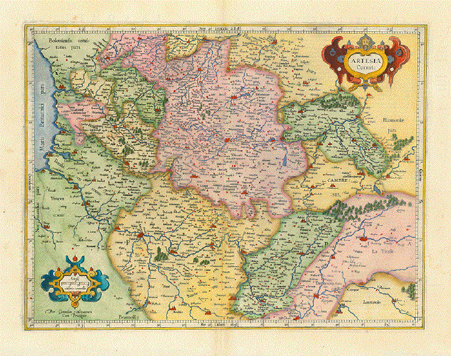 ãArtesia comit." Le Comte D'Artois ( France - northernmost province âArtois') Copper etching by Gerard Mercator (1512 - 1594). Hand-colored. Duisburg, ca. 1600 Map extends from the Atlantic Ocean (river mouths of Canche, Authie and Somme in the west to Berlaimont sur Sambre and Guise sur Oise in the east and from the Belgian border to the inflow of the Somme into the Oise. Minor traces of age and use in Margins and along centerfold 34.7 x 44.8 cm (13.7 x 17.6") $ 300.00 Order Nr. FRANCEMAP238904 |