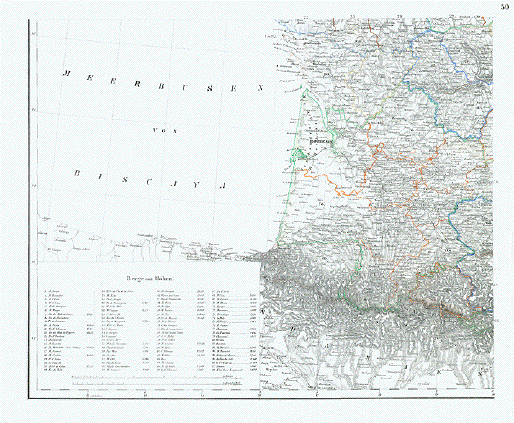 Map of Southwestern France. In the lower left corner is a list of the major mountains of Southwestern France with the elevations. Steel engraving map from Stieler published ca 1870. Fine, clean map with only very minor signs of age and use. 32.5 x 39 cm ( 12.7 x 15.3 ") $ 60.00 Order Nr. FRANCEMAP240886 |
