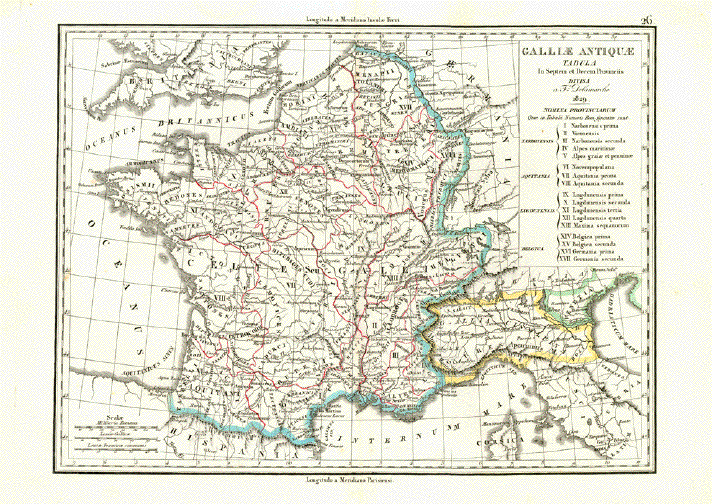 "Gallae Antiquae Tabul In Septem et Decem Provinciis Divisa......) Copper engraving by F. Delamarche in 1829 and published 1832. Original hand outline coloring. In the upper right is a list
