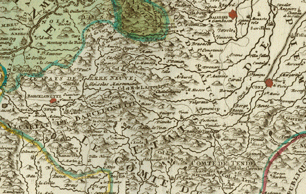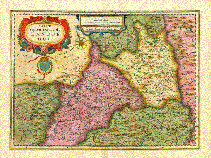 La Partie Septentrionale du Languedoc". Northern part of the Languedoc. Copper etching. Hand coloring. Published by Jodocus junior and