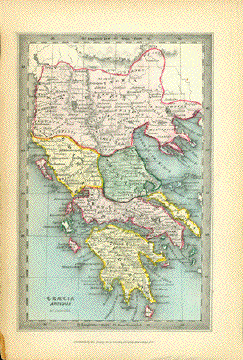 "Europaeische Tuerkey Griechenland und die Ionischen Inseln 1850." Steel etching by Renner from "Neuster Zeitungs Atlas. Alter und Neuer Erdkunde" by J. Meyer, ca 1855. Original outline coloring. Very interesting historical map showing the region that was under Turkish rule. (the part within the blue lines). The map is very detailed. In the upper left corner is a small part of Austria. In the upper right is part of Podolien and Cherson in Ukrania. At the bottom of the map is a color key showing the political divisions of the region that corresponds to the colors of the lines on the map. Very clean map with wide margins. 23.5 x 18.2 cm ( 9.2 x 7.1 ") $ 85.00 Order Nr. GREECEMAP1294 |