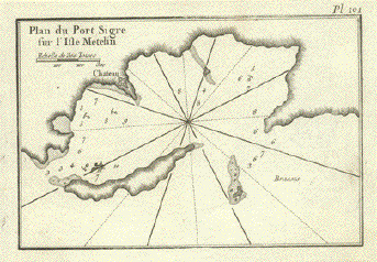 "I Metelin Port Olivier". Copper engraving by Joseph Roux from "Recueil des principaux plans des ports et rades de la Mer Mediterranée" , 1779. The "north" arrow points to the upper left