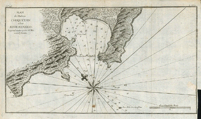 "Plan des Hafens Chequetan oder Seguataneo liegend unter 17 Gr. 36 Min. nordl. Breite" Plan of Zihuatanejo I'm Staat Guerrero, Mexico. The almost land-locked bay of the Pearl on the Mexican Pacific Coast. Left side of bay: Town Beach. Madera Beach is not shown as a beach. Right side of bay: La Ropa Beach and Las Gatas Beach in front. Copper etching. Published in "Des Herrn Admirals, Lord Ansons Reise um die WeltÉ in the years 1740, 41, 42, 43, 44É" Goettingen, 1763 RARE! German edition of "Voyage around the World" by Lord George Anson Map has one horizontal and four vertical folds to fit book size. Left margin has small repaired tear, not reaching map image. Lower right corner has cutback for binding purposes with a small repaired tear. General age toning .One foxing spot near wind rose. Very good print quality. MAP IMAGE: 20 x 36 cm (ca. 7.9 x 14.2") $ 400.00 minus 30% Discount = $ 280.00 Order Nr. MEXICOMAP253307 |