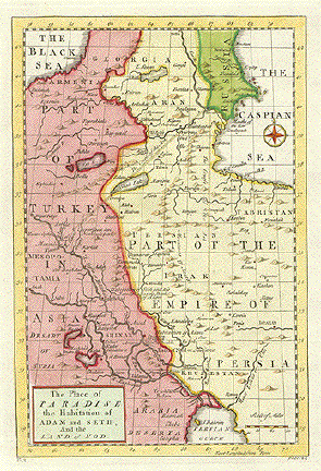 "Carte du Paradis Terrestre adaptée aux deux systèmes de D. Calmet et de HuetÉ" The Paradise on Earth or Earthly Paradise has been located in many places on our planet. Several cultures have produced legends around this subject matter. The word paradise is Persian in origin and was allocated to their famous fruit gardens and their parks. The ancient Jews, when they speak of Paradise, meant the "Garden of Eden" (Septuagint Bible). That was the location, uncertain where it actually is, was where Adam and Eve lived, sinned and where expelled from. This map, copper etching by Barriere brothers in Paris and dated 1820, shows EDEN in Armenia, south of the Black Sea and west of the Caspian Sea. Very good condition. 22 x 16 cm (ca. 8.7 x 6.3") $ 65.00 Order Nr. CAUCASIAMAP252941 |