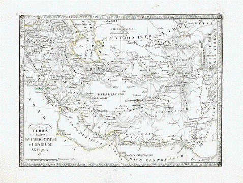 "Terra inter Euphratem et Indum Antiqua" Copper engraving ca 1780. Interesting map with the antique names of the region. Map is is clean. In lower margin is a rubbed area. Minr signs of age and use in margins. 17 x 22.4 cm ( 6.6 x 8.8 ") $ 90.00 Order Nr. MIDDLEEASTMAP240705 |