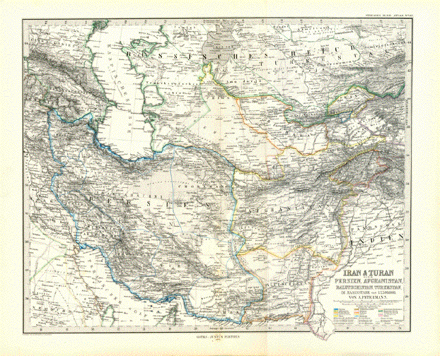 "Iran & Turan oder Persien, Afghanistan, Balutschistan, Turkistan" Middleeast map. Steel engraving with borderline original coloring after the drawing by August Heinrich Petermann (1822-1878) Published in Gotha, 1875 Four tiny holes from binding i centerfold. 33,2 x 40,6 cm (ca. 13 x 16") Order Nr. MIDDLEEASTMAP248040 SOLD |