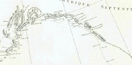 "Carte de L Entree de Norton, et du Detroit de Bhering on l on von le Cap le plus Oriental de L Asie et le Pointe la plus Occidentale de L Amerique". Copper engraving by Benard for Rigobert Bonne 1788. Map shows the Bering Strait from the coast south to Norton Sound to the Coast north of Cap du Prince du Galles. The lines show the voyages of Captain Cook in 1778 and 1779. Map has original folds to fit book size. A few minor spots. 26.5 x 38.5 cm ( 10.4 x 15.1 ") $ 145.00 Order Nr. NORTHAMERICAMAP2109 |