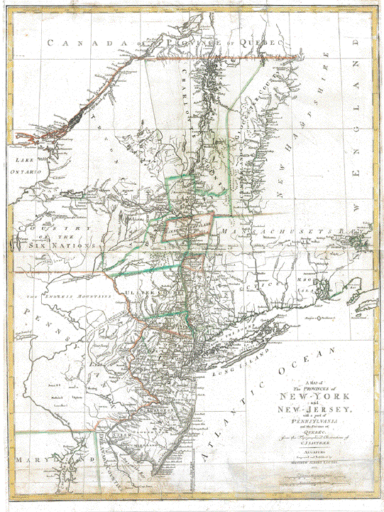"A Map of The Provinces of New-York and New Jersey with a part of Pennsylvaniy and the Province of Quebec from the Topographical Observations of C. J. SauthierÉ" Hand colored copper etching. Engraved and published by Matthew Albert Lotter 1777.
