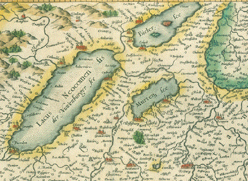 "Das Wiflispur-Gerow" Copper etching by Gerard Mercator (1512-1594) Original hand coloring. Published in the Mercator-Hondius Atlas Amsterdam, 1607 Renaissance title cartouche Verso: Text in Latin The German name Wiflisburg is totally out of use in our time. The town is called Avenches in the Swiss Kanton Waadt (Vaud) The map shows the south-west area of Switzerland. Basically the area between Bieler See - Neuburgersee (Lac de Neuchatel) - Murtensee - Thuner See and Lake Geneva (Genfer See - Lac Leman). General age toning. Along north