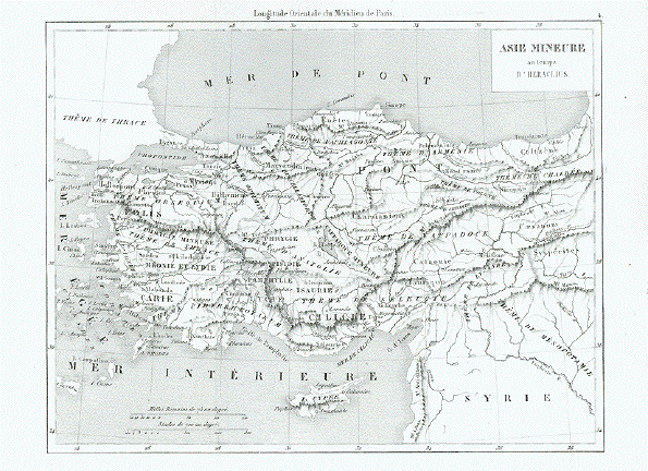 "Asie Mineure sous la domination Romaine D'Auguste a Diocletien" Steel engraving map, 1862. Shows Asia Minor at the time of Roman domination. Good condition. Vertical folds to fit original book size. 17 x 21.7 cm ( 6.6 x 8.5 ") $ 65.00 Order Nr. TURKEYMAP241765 |