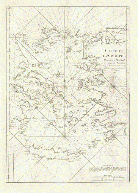 "Carte de L'Archipel Presentee a Monseignr. le Comte de Maurepas Par le Sr. Grognard Pilote Entretenu au department de Toulon. 1745" Giant folio size map of the Aegean Sea (Eastern Mediterranean Sea) showing in great detail the East and North Coasts of Greece, the Dardanelles, the Sea of Marmara, the West Coast of Turkey and all the islands south to Crete (Kreta) Type of print: Copper etching Publisher: Nicolas Bellin Published: Toulon, 1745 Condition: Near Excellent. There are some thin spots in this very thick laid paper. Watermark. Very clean. Hardly any traces of age and use. RARE! Very desirable and very collectible! Map size: 76,4 x 53,6 cm (ca. 30 x 21.1") Sheet size: 88 x 61 cm (ca. 34.6 x 24") $ 1650.00 Order Nr. GREECE242201 |