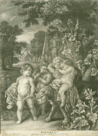 "Bacchus" Mezzotint by Bernard Lens II (1659-1725) After the painting by Anthony van Dyck London, ca. 1690 Bacchus, as a child, riding