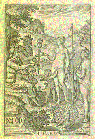 "Paris Voluptatenem sequens, Sapientia, Diuitysque posthabitus, Veneren coelesti munere dignatur, Sic Libido Troiam euertit" Paris and the three Grazie. Paris giving the Golden Apple to Aphrodite, Hera and Athena at left. Copper etching by Geronimo