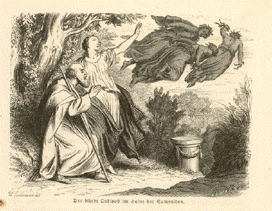 "Der blinde Oedipos im Haine der Eumeniden" Wood engraving 1867. Below the