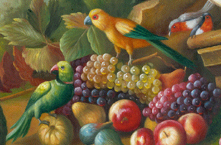 Oil painting (on laminated beaver board) A cluster of red, rose and white grapes among other fruit i(Apples, peaches, figs, pears, cherries)s surrounded, in a setting of antique ruins, by a bunch of exotic tropical birds, among them an ara and a cockatoo having a palaver over their unexpected discovery. Well executed bizarre and whimsical painting in wonderfully bright colors and great artistic mastership. This scurrile painting is not signed or dated. Our estimate is that it dates back to the nineteen sxties when the type of beaver board, (Hartfaser) used here, came on the market. Colors are fresh, bright and clean. Birds and fruit are realistically depicted. The fact, that this painting is even 12 x 16" allows for the assumption, that the artist was British or American or at least worked where inch-measuremnets are used. Condition: Without the least of blemish! 30.5 x 40.7 cm (12 x 16") $ 380.00 Order Nr. WINE235725 |