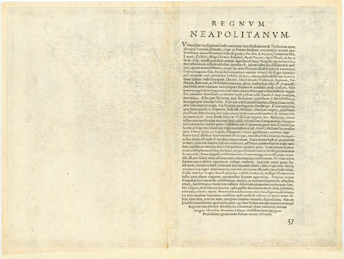 Nr. 37 - "Regni Neapolitani Verissima secundum Antiquorum et Recentiorum Traditionem Descriptio, Pyrrho Ligorio Auct." Copper etching. Southern Italy and Naples. Lower margin has been widened. 36,5 x 50 cm (ca. 14.4 x 19.7") Order Nr.ORTELIUSFIRSTEDITION247780SOLD |