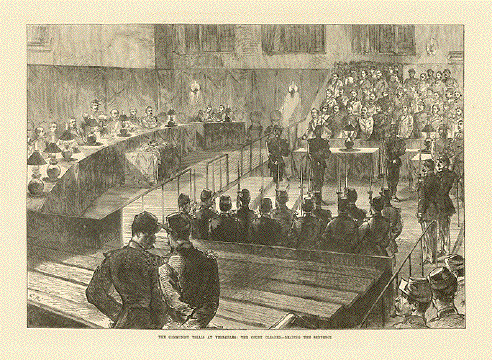 "The Communist Trials at Versailles: The court cleared-Reading the Sentnce" Wood engraving published 1871. On the reverse side is a small article about the trials. Image: 21.5 x 31 cm ( 8.4 x 12.2") $ 40.00 Order Nr. POLITICS240846 |