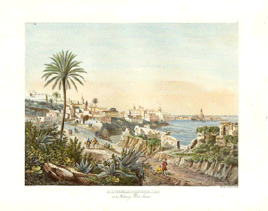 ALGERIA The following sequence of 24 views of Algeria originates from Adolphe Otth's travel observations in Algeria. He was the designer and lithographer for this astounding series which were published by J. F. Wagner at Berne, Switzerland.Ca 1850 as ãEsquisses africaines, dessinées pendant un voyage à Alger". The total series has 30 views. Unfortunately we are missing 6 of them. The plates are clean, have wide margins, their modern hand coloring is exquisite. Some plates have general age toning, others are white in margins. The general condition of this scarce and very attractive series is mostly very good. On most prints margins are a bit wrinkly, which however, is hardly disturbing the general impression of these splendid views, especially when considering that much of the margins will be covered by mattings. (Other faults if any are mentioned individually. Plate size: 31,5 x 35 cm 12.4 x 13.8" Prices and image sizes are given below each lithograph.