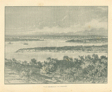 "Entrée de Port-Jackson." Wood engraving ca 1880. 12.4 x 18.7 cm (4.9 x 7.4'') $ 25.00 Order Nr. AUSTRALIA2478 |