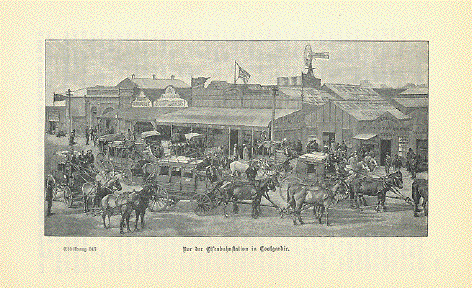 "Vor der Eisenbahnstation in Coolgardie" ( railroadstation in Coolgardie ) Wood engraving 1900. Reverse side is printed. 9 x 18 cm ( 3.5 x 7 ") $ 35.00 Order Nr. AUSTRALIA245677 |