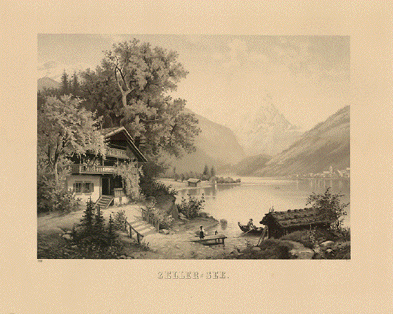 "Zeller-See" Photogravure from a lithograph by an anonymous artist Vienna, ca. 1880 Idyllic view of Zeller Lake towards the old part of Zell am See, before any big construction changed the landscape. (At that time Zell am See had under 2000 inhabitants verso almost 10000 in 2006). In the background we see snow-covered mountain Grossglockner. Light general age toning. Otherwise fine condition with very wide margins. Image size: 35,8 x 51 cm (ca. 14 x 20") Sheet size: ca. 51 x 69 cm (20 x 27") $ 280.00 Order Nr. AUSTRIA237554 |