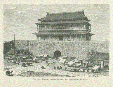 "Das Thor Tsien-men zwischen Tartaren- und Chinesen-Stadt in Peking" Wood rngraving published 1887. On the reverse side is text about temples in Peking. Image: 11 x 15.5 cm ( 4.3 x 6.1") $ 25.00 minus 40% Discount = $!5.00 Order CHINA257338 |