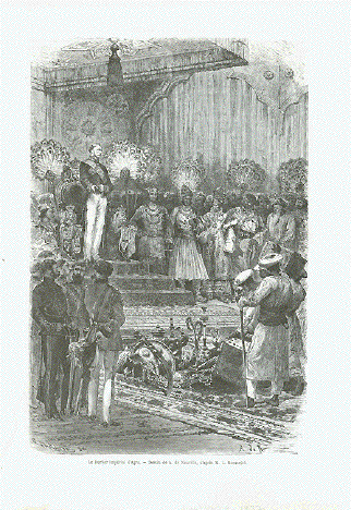 "Le Durbar imperiale d'Agra" Wood engraving by Neuville and Rousselet, 1872. Reverse side is printed. 23.5 x 15.5 cm ( 9.2 x 6.1 ") $ 25.00 Order Nr. INDIA243719 |