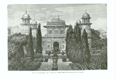 "Mausolee de l'Elmaddowlah, a Agra." Wood engraving made after a photograph, 1872. Reverse side is printed. 15.5 x 23.5 cm ( 6.1 x 9,2") $ 25.00 Order Nr. INDIA243812 |