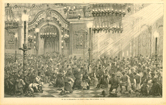 "Die Feier des Weihnachtsfestes in der Kirche zu Heilgen Grabes in Jerusalem" Wood engraving showing the