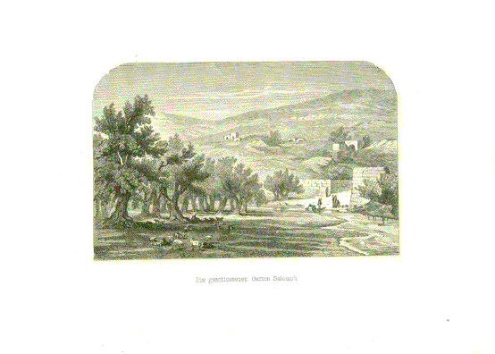 Jerusalem. - "Die geschlossenen Gaerten Salmon's" (Solomon's Gardens) Toned wood engraving Minimal spotting in margins Published: Berlin, 1861 10 x 16 cm (ca. 3.9 x 6.3") Page size: 20 x 27.5 cm ( 7.8 x 10.8") $ 60.00 (minus 40% = $ 36.00) Order Nr. JERUSALEM257609 |
