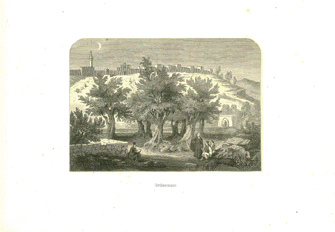 "Gethsemane" (Getsemani) Toned wood engraving Minimal spotting in margins Published: Berlin, 1861 Image:10,5 x 15,2 cm (ca. 4.3 x 6") Page size: 20 x 27.5 cm ( 7.8 x 10.8") $ 70.00 (minus 40% = $ 42.00) Order Nr. JERUSALEM257623 |