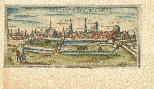"Aldenburgum Holsatiae" ( This print was false labeled. It is Stade in Lower Saxony) Copper engraving by Braun and