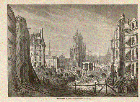 "Les ruines du quartier Latin, vue de nuit." Wood engraving ca 1870. On the