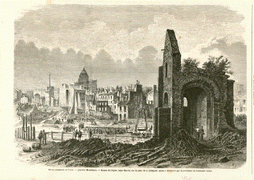 "Embellissements de Paris. - Quartier Mouffetard. - Ruines de l eglise Saint-Marcel, sur le place de la Collegiale, mises a decouvert por le percement du boulevard Arago." Wood engraving, 1868. Reverse