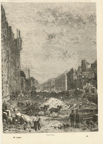 "Paris Demolitions. - Removal of a Portion of the Quartier Latin. - From a drawing by M. Thorigny" Wood engraving dated 1869. On