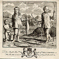 "Isciuktsci" Type of print: Copper etching Codor: Original hand coloring Engraver: Giovanni Antonio Sasso Milano, ca. 1820 Good condition except for small spot on upper edge. Native people living on the Kamchatka Peninsula, far east Russia. This family belongs to an indigenous people called Itelmene. They live near Koriaki. The woman shows tattoos on face, arm and leg. 13,5 x 21,5 cm (ca. 5.3 x 8.5") $ 70.00 Order Nr. RUSSIA243351 |