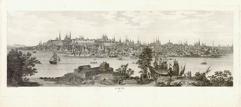 Kasan. - "Cazan 1767" Capital of Tatarstan Type of print: Copper etching Engraver: Francois Denis Nee Artist (drawing): By Nicolas Louis de Lespinasse (1737-1808) Publication: "Historique physique, morale, civile et politique de la Russie Ancienne" Author: N.G.Le Clerc Published: Paris, 1783 A marvellous, spectacular and large panoramic view of Kasan across the river Volga (Wolga). Condition: Upper right margin (about 1/3) has been added (no loss of image). Right plate mark has been partially repaired. Upper margin has a small repaired tear reaching slightly into sky of image. Left margin has repaired tear (paper edge to plate mark). Vertical fold to make the engraving fit book size. Light general age toning. Image: 21,5 x 64 cm (ca. 8.5 x 25.2") Order Nr. RUSSIA238561SOLD |