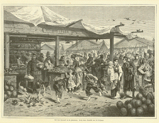 Bazar zu Astrachan Wood engraving from an illustrated work ca 1875. Reverse side is printed. 9.2 x 12.3 cm ( 3.6 x 4.8 ") $ 25.00 minus 40% Discount = $ 15.00 Order Nr. RUSSIA2070 |