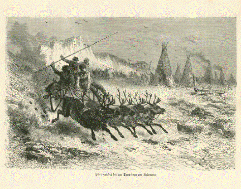 "Samojeden Lager" ( Samoyed camp ) Wood engraving published 1877. Reverse side is printed. 11.5 x 15.5 cm ( 4.5 x 6.1 ") $ 20.00 Order Nr. RUSSIA244446 |