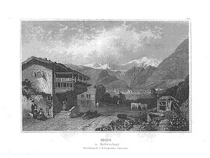 "Naters and die Berner Alpen von der Simplon Strasse gesehen" Steel engraving ca 1850. Hand coloring. Narrow margins. 7 x 10 cm ( 2.7 x 3.9 ") $ 20.00 Order Nr. CH239390 |