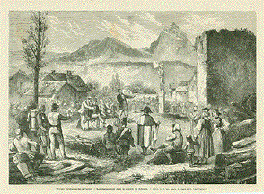 "Le dimanche des Brandons a Yverdon (Suisse )" Wood engraving 1878. Reverse side is printd. 15 x 21.5 cm ( 5.9 x 8.4 ") $ 45.00 Order Nr. CH249606 |