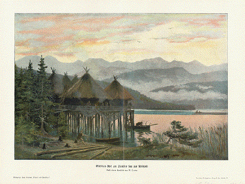 "Pfahlbau-Dorf am Zuericher See zur Steinzeit" ( Stone-Age Village on lake Zurich ) Fine chromolithograph after a