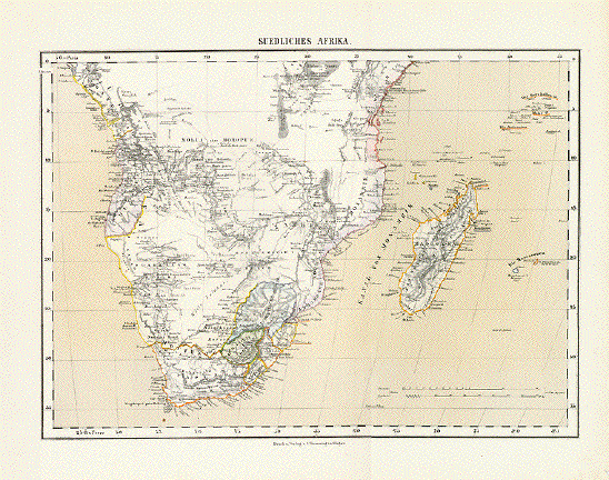 "Südliches Afrika" South Africa Republic of South Africa, Lesotho, Swaziland, Namibia, Botswana, Zimbabwe, Mozambique, Angola, Zambia Malawi, Democratic Republic of Congo, Tanzania. Madagascar, Mascarene Archipelago, Seychelle Islands. These would be the countries as they are bordered nowadays. Map naturally shows the borders of 1872. Toned lithograph with original borderline hand-coloring. Published in Sohr-Berghaus-Atlas. Printed by C. Flemming. Glogau, Germany, 1872 Wide margins. Only minimal traces of age and use. 29,5 x 40,5 cm (ca. 11.6 x 15.9") $ 140.00 MINUS 40% Discount = $ 84.00 Order Nr. AFRICAMAP240480 |