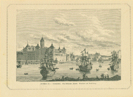 "Stockholm in 17. Jhrhundert. Das koenigliche Schloss" Wood engraving after Dahlberg.